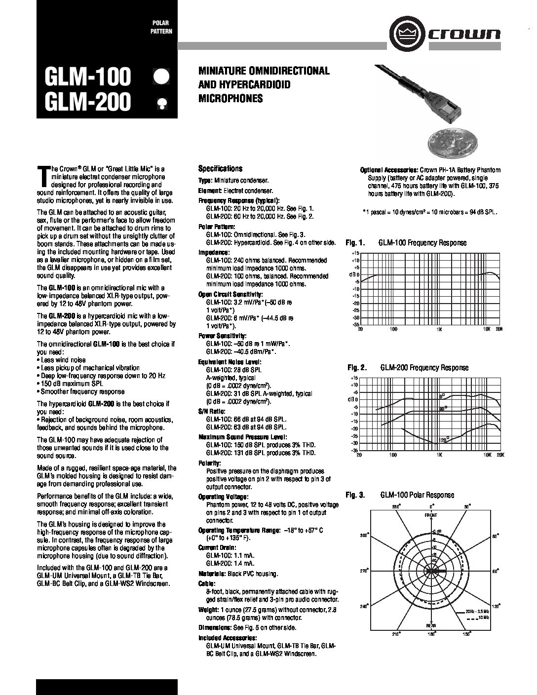 The Crown® GLM or “Great Little Mic” is a miniature electret condenser microphone designed for professional recording and sound reinforcement. It offers the quality of large studio microphones, yet is nearly invisible in use. The GLM can be attached to an acoustic guitar, sax, flute or the performer’s face to allow freedom of movement.